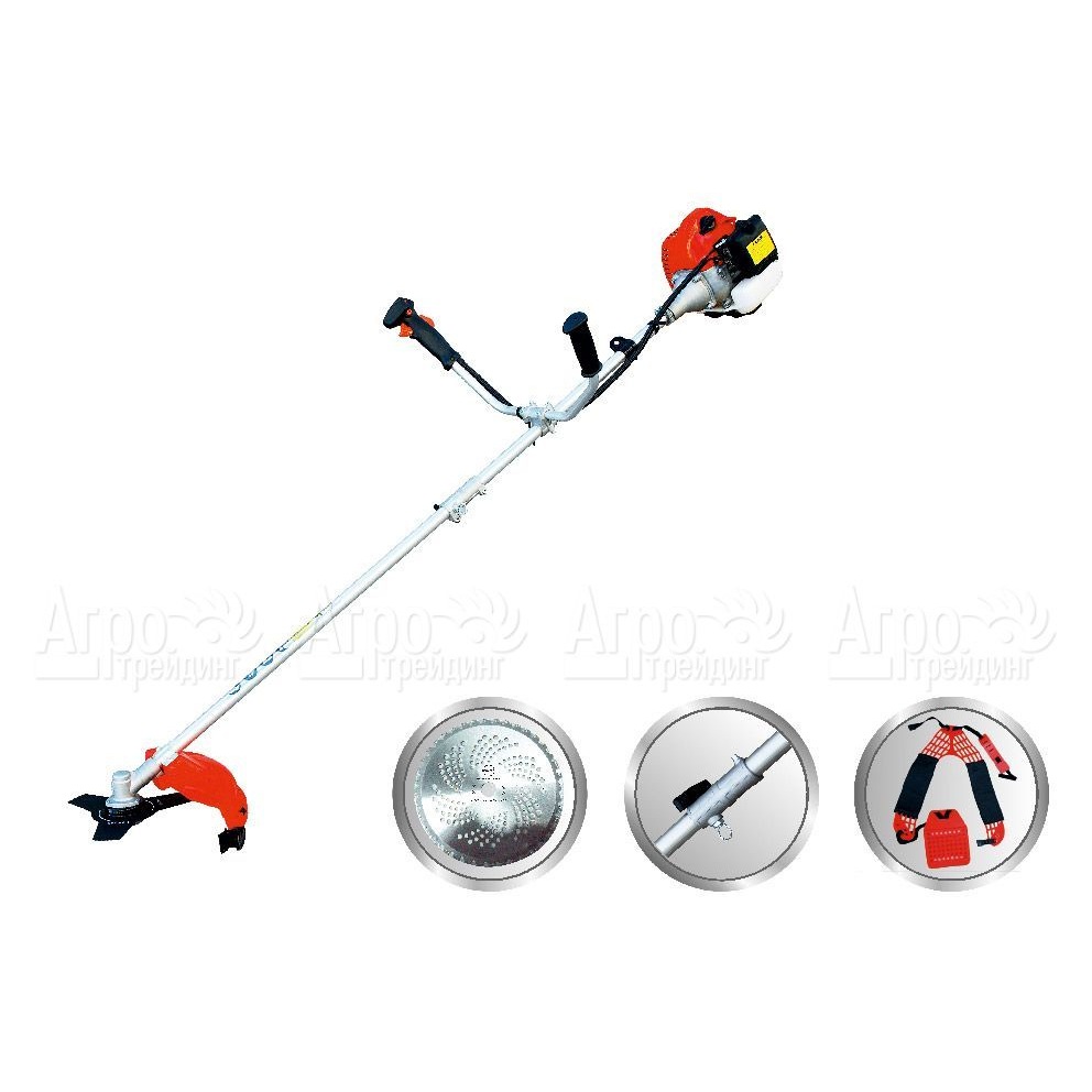 Характеристики товара: Бензокоса (бензиновый триммер) Profi CG350BПодробное описание товараБензокоса (бензиновый триммер) Profi CG350В -практичный садовый инструмент для ухода за приусадебными территориями с разным рельефом. Три вида режущих насадок -триммерная головка с леской, трехлопастный нож и зубчатый диск, которыми комплектуется инструмент, позволяют косить газон, сорную растительность разной жесткости и поросль кустарников. Триммер оснащен прямой штангой с двуручной рукояткой велосипедной формы. Резиновые накладки на ручках препятствуют соскальзыванию руки, форма рукоятки максимально удобна для управления бензокосой (бензиновым триммером) Profi CG350В и обеспечивают свободную амплитуду размаха. Ранцевая оснастка способствует снижению нагрузки, дает возможность равномерно распределить вес бензокосы на все туловище. Подача лески осуществляет при легком ударении катушки о поверхность почвы.