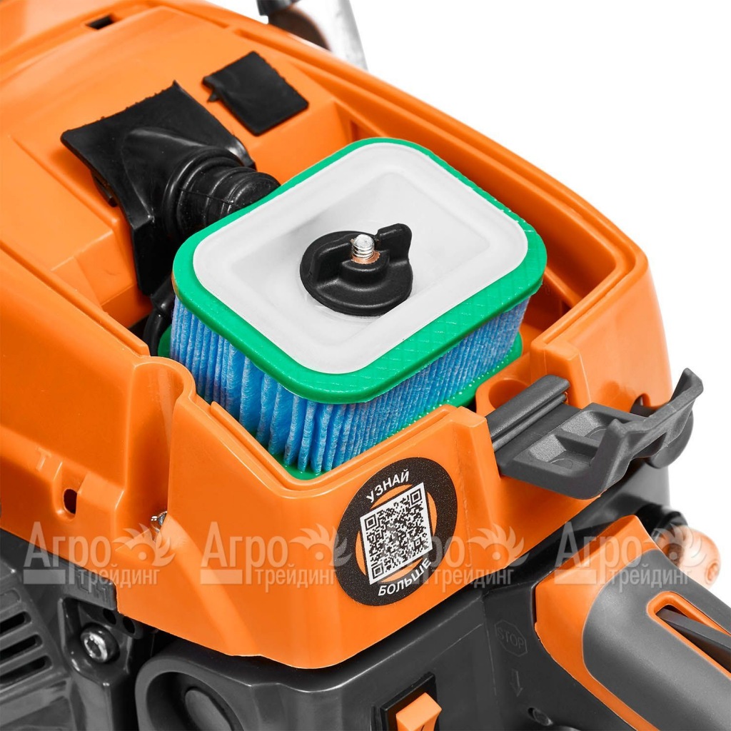 Высокую мощность, значительную производительность и длительный срок безотказной эксплуатации бензопилы гарантирует качественный экономичный двигатель с увеличенным ресурсом. Важной особенностью инструмента является повышенная прочность конструкции и использование исключительно надежных фирменных узлов и деталей.  Комфорт оператора гарантируется превосходной сбалансированностью пилы и малым уровнем вибрации.